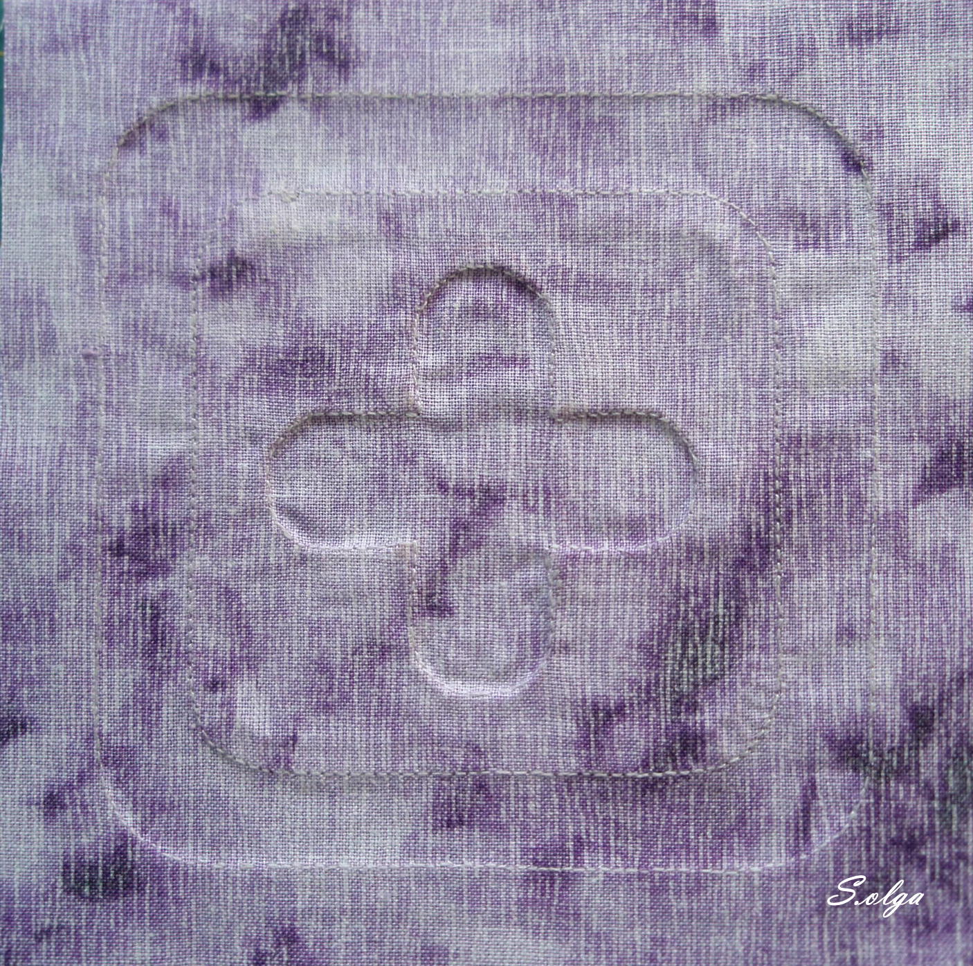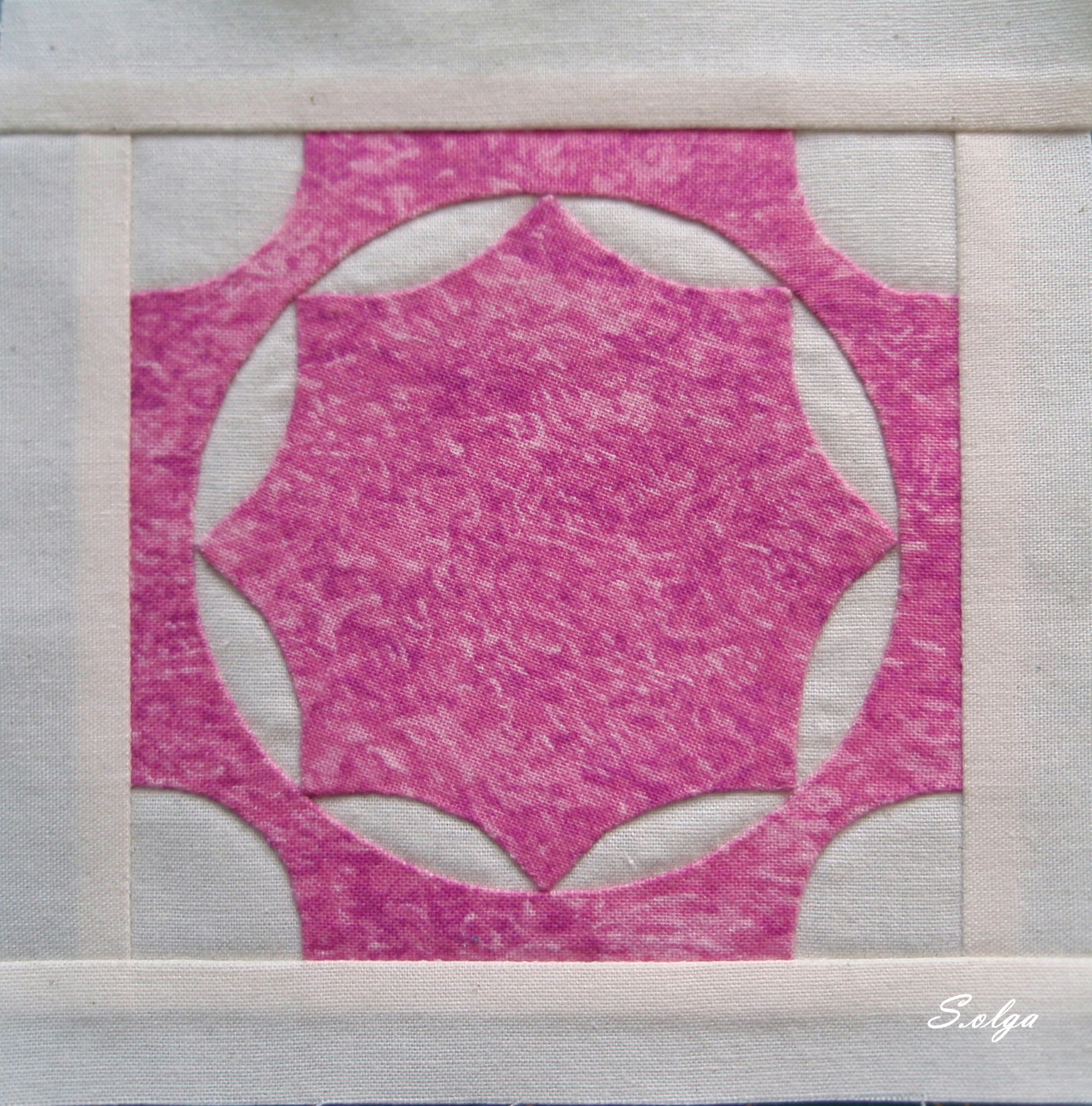 Пыталась попробовать предложенную Ириной обратную аппликацию. Не получилось совсем: в уголочках очень трудно закрепить ниточки, припусков-то нет. У меня все разлохматилось в центральном квадратике и я отложила. После всех блоков взялась, перекроила, приготовила шаблоны и сделала обычную аппликацию.